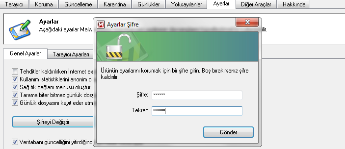 Genel ayarlar bölümünde istatistikleri, tarama bittikten sonra tarama notunu taram bittiğinde açılması ve kaydedilmesi, günlük dosyasının kaydedilmesi, tarama sonunda bulunan zararlı yazılımları silmek için tarayıcı ayarı ve son olarak en önemlilerinden şifre koruması koyarsanız sizden habersiz Malwarebytes Anti-Malware antivirüs programında yapılacak ayarlar için şifre ister.Buda sizden habersiz kimse programda değişiklik yapamaz.