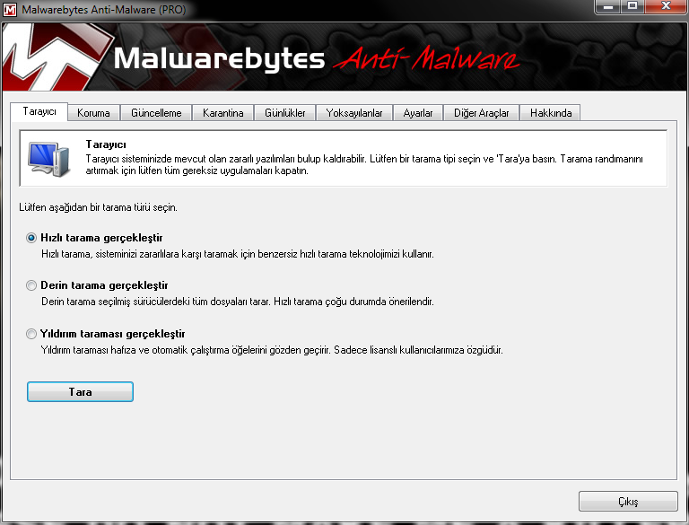Malwarebytes Anti-Malware Hızlı, Derin ve Yıldırım taraması