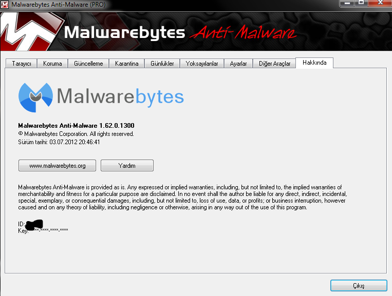 Hakkında bölümünde ise Malwarebytes Anti-Malware programının web sitesine ulaşabileceğiniz link butonu ve yardım butonları bulunuyor.